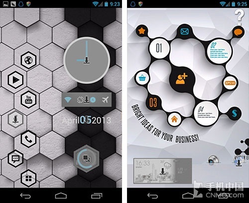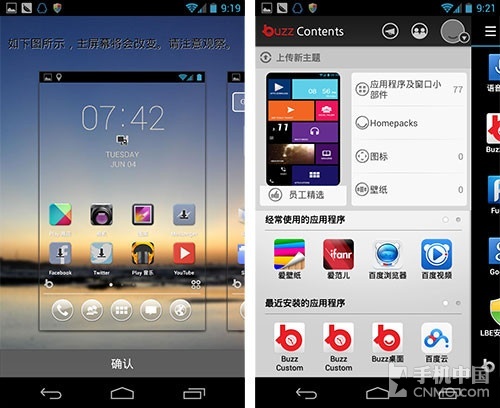 我觉得没有必要向大家介绍Buzz有什么好用的功能了,在Buzz桌面绚丽的主题面前,它是否有隐藏图标,是否可以修改图标样式等等功能变得已 经不再重要了,你只要知道,进入程序列表后,点击左上角按键进入主题商店就可以,Buzz的主题可不仅仅是换个壁纸换个图标那么简单,华丽的桌面样式让你 感觉简直就像是换了个手机。
