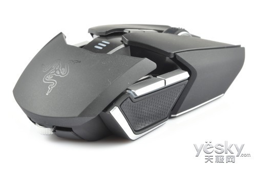 在可更换的侧面板上方,左右各有2颗侧键,同时侧面板也可以按下成为第三个侧键。而Razer考虑到了部分用户并不需要那么多侧键,而且在游戏中会引起误操作,在鼠标底部有2个独立的开关,可以单独锁定左、右面板按下的功能。