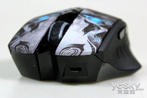 血手幽灵血魔骷髅R8提供前置充电接口,用户通过鼠标自带的迷你USB数据线为鼠标进行充电,另外值得一提的是,血魔骷髅R8鼠标采用的是内置锂电设计,因此鼠标并不重,提供了足够舒适的操控感。而并不会因过重的体驱造成鼠标启动的放缓。