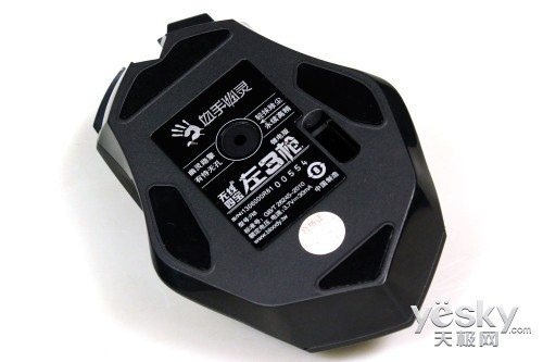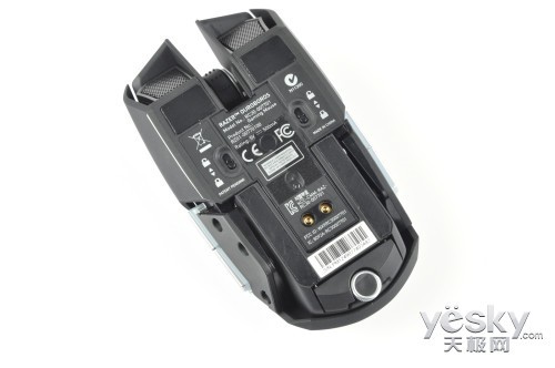 因为采用内置锂电的设计,因此在鼠标底部我们并没有发现电池仓盖。从底部可以看到原来应该有电池收纳仓的位置已经被鼠标USB接收器收纳仓所代替,中间的是血手幽灵无孔引擎。