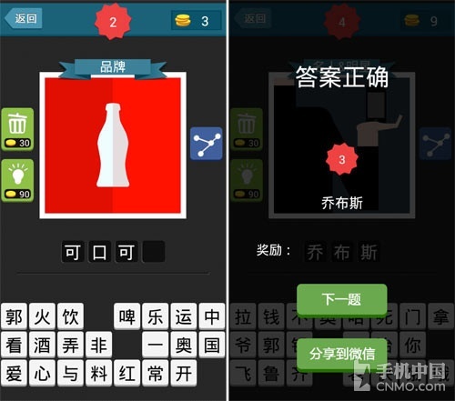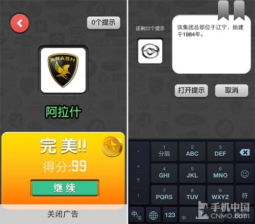 另外,游戏提供了两种提示的方式,一种是直接揭开谜底,而另一种则是通过一些简单的叙述告知玩家。当然,这两种暗示方式都是有次数限制的,如果 用完的话是需要玩家到游戏商店内进行购买的。不过呢,当玩家连续猜对几个车标的时候,游戏还是很厚道地自动加上几次提示的次数,这个设定还是相当贴心的。