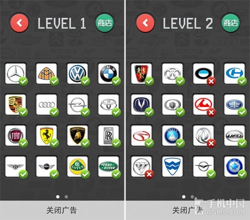 目前,“疯狂猜车”共为玩家提供了9大关卡,共180个车标。与“疯狂猜图”的思路一样,在本作中所有的车标都是经过游戏开发商的二次处理,基 本上不会让玩家一眼就能识别出来。另一方面,这里的车标的涉及范围是全球的,无论是大厂商还是小作坊,乃至名声并不很显赫的改装品牌,这里全部都有。