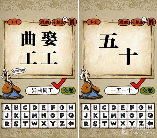 对于聪明的读者来说,光是看名字就应该知道游戏的玩法了吧。没错,就是那种“填空”的玩法,如果你之前接触过类似于“我要猜歌词”等游戏的话, 上手这个就更简单了。游戏中,玩家必须通过一幅画或几个字的组合来猜一个成语,巧妙的图字结合,足能让你苦思冥想很长一段时间。如果你实在猜不到,可以点 击“小纸条”来获得答案,只不过数量是有限的,用完之后还需要到游戏商城内购买。