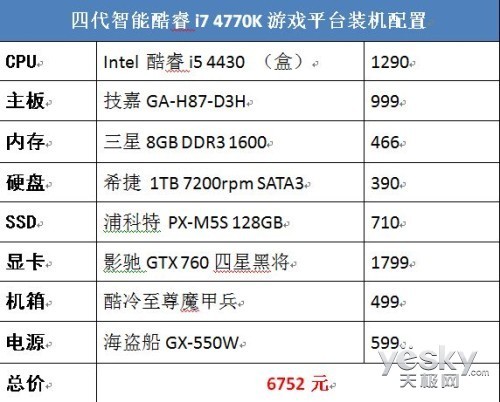 此套装机配置的总价为6752元,其整体性能足以和高端万元电脑相媲美。尤其是酷睿i5 4430处理器与显卡新品GTX 760,他们的搭配也成为了中端最具代表性的高性能组合。