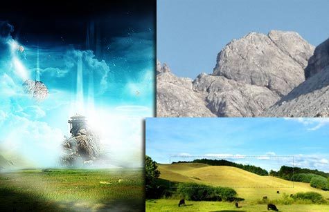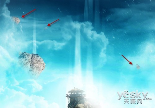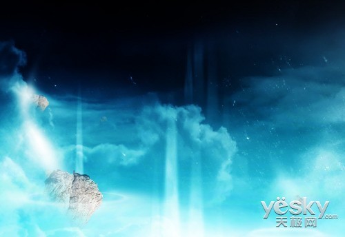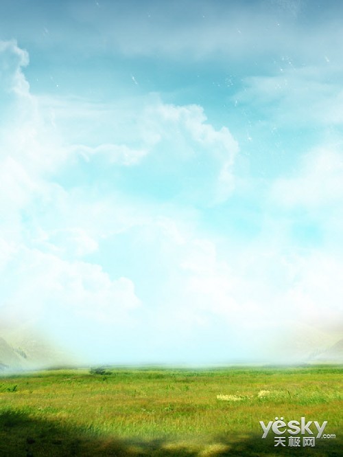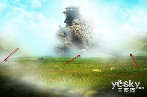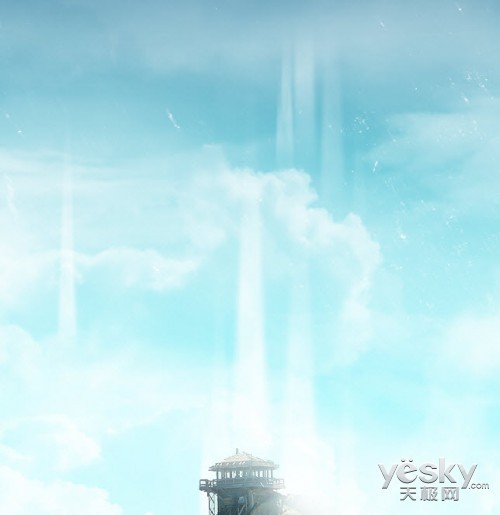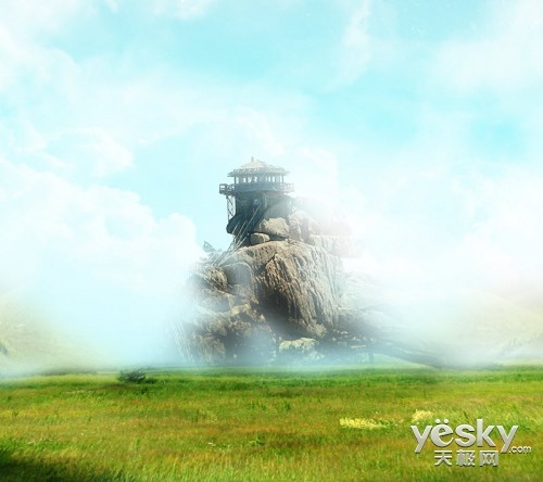 本教程介绍如何使用Photoshop软件将一些普通的景观图片快速合成出超现实主义的幻想场景。本例制作的步骤比较多,但是方法并不难。我们将会用到Photoshop的图层混合选项、图层、蒙版、各种调整、云彩滤镜以及各种工具。主要步骤包括渐变背景、增加草地、塔、漂浮岛屿,表现云朵中洒下的光柱以及光环等特效。