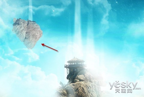 将其粘贴到图中,将这个新层命名为“大石头”,移动位置到画面的左上方,用于制作漂浮的岛屿,如图所示。