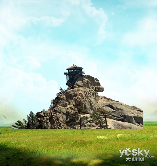 本Photoshop图像合成需要用到的素材包括:云朵、杂点、瞭望塔、草地、山丘、石块等。