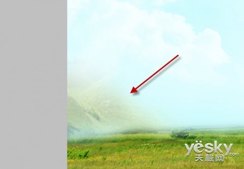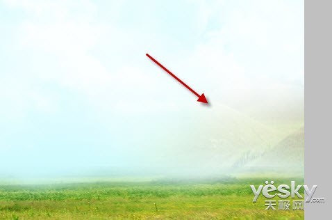 将复制的山岳素材复制到画面,调整位置到整个画面的右侧,同样使用大尺寸的柔软的橡皮擦工具模糊边缘,如图所示。