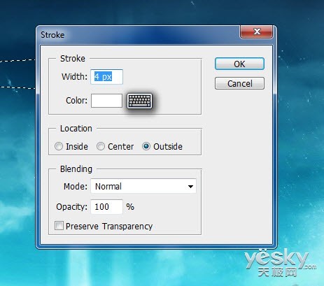 在弹出的描边对话框中,使用下图所示的设置,宽度:4px、颜色:白色、位置:居外。