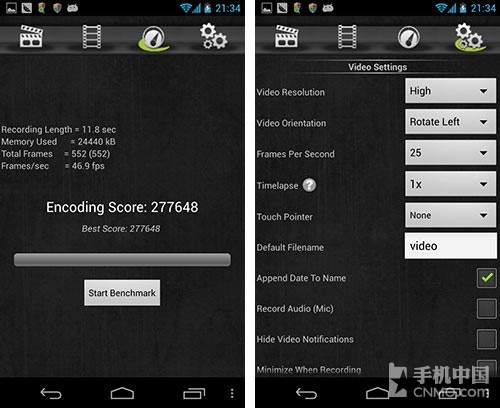 屏幕录制也就是我们所说的内录,这个工作需要手机的性能相当强,目前的ScreenCast Recover在大部分高端机型上已经有了不错的表现,当然首先是要应用支持。而录制的选项也包括了录制的清晰度,录制的帧数以及录制时屏幕倾斜方向等, 在录像过程中还允许用户来进行拍照。