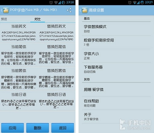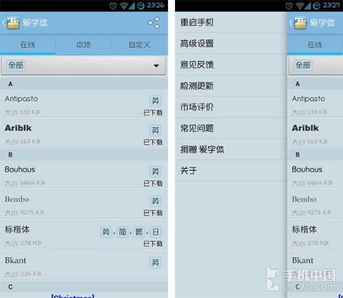 爱字体是Play商店上一款比较热门的字体替换软件,这款软件也为三星机型进行了专门优化,三星机型的朋友可以不必root就获得字体替换的效 果,而对于全部用户来说,想替换系统字体就只有通过root了。相比风险大的自行替换系统字体,爱字体支持字体的备份,风险相对较小。