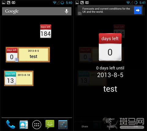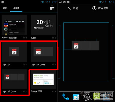 《Days Left》利用了安卓系统的桌面小部件功能,设置起来也非常方便。先在进入程序抽屉找到《Days Left》的小部件,大家可以看到一共有三种规格,选一种放到桌面上就可以开始设置了。