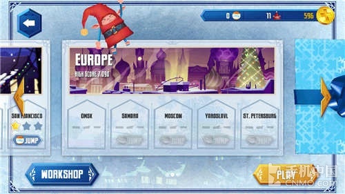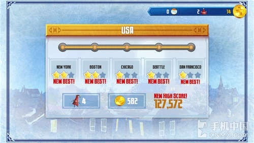 游戏所涉及的场景遍布全球,在最开始的时候,玩家需要先到美国的上方溜达一圈。每个场景下都会有5个城市,在“美国”关卡中,就包含了纽约、波士顿、芝加哥、西雅图和圣福兰西斯科等著名城市。当玩家达到一定分数的时候即可解锁下一关卡。