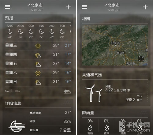 上下划动可显示详细的天气信息,左右划动可显示自己设定好喜欢的地点,在弹指间便可获得最精确的天气预报。在详细的天气状况特性中,我们还能够看到互动式雷达图、卫星图、高温图、风向图、湿度检测、紫外线指数以及降水预报等信息,相当的全面。