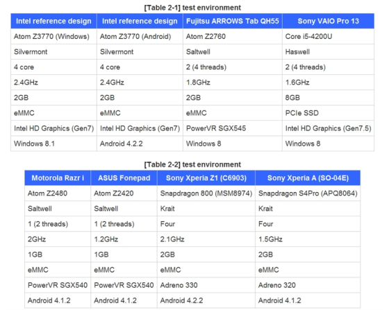 最后是PCWatch的跑分,除了Z3770参考平板之外,还找来了两台平板机和三部手机: