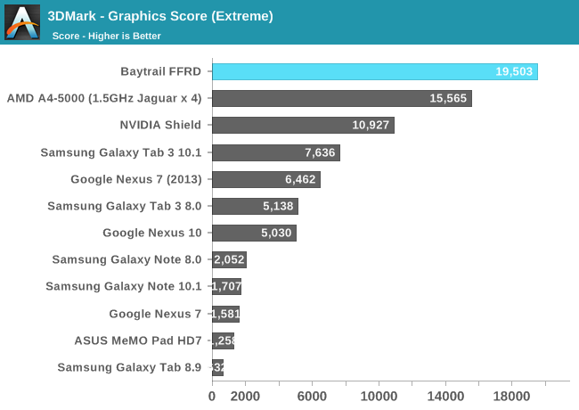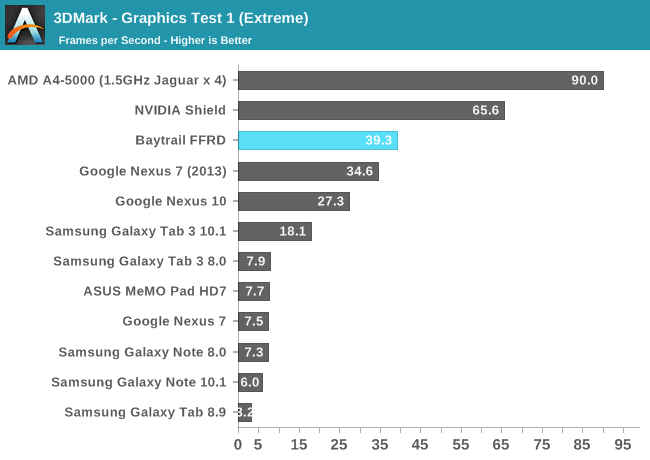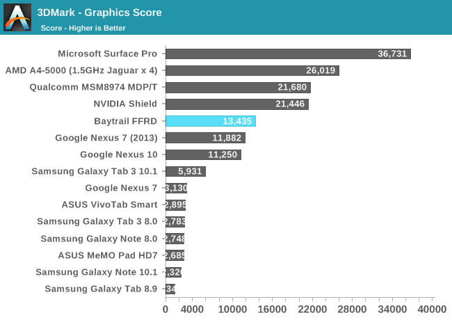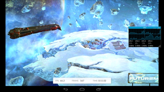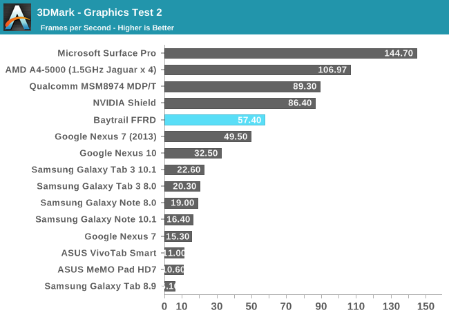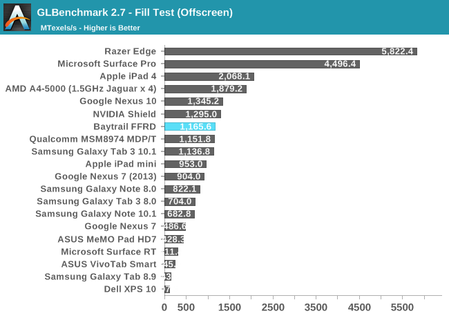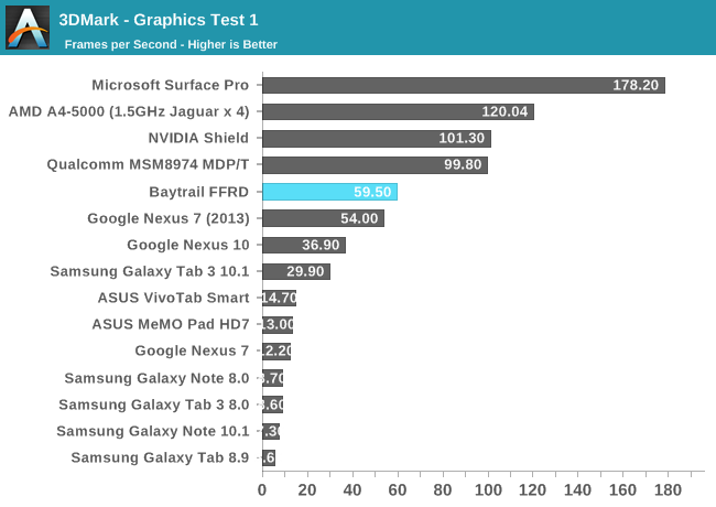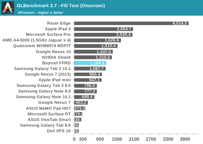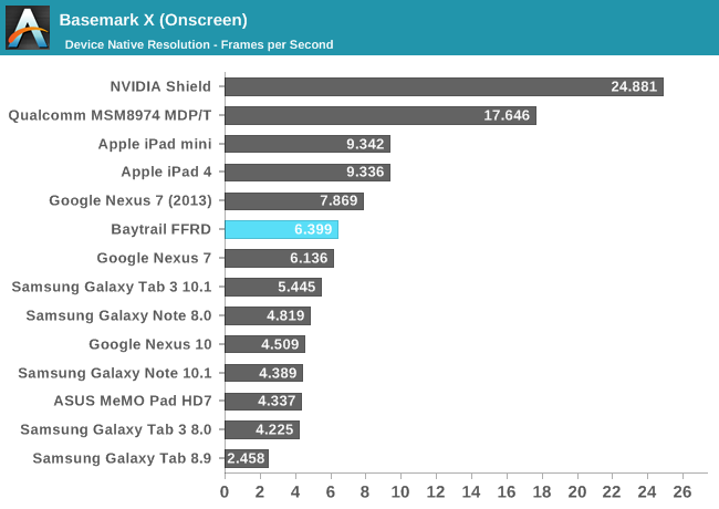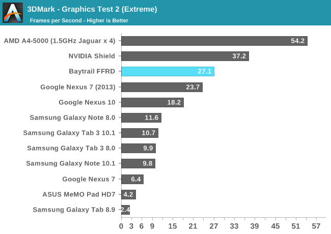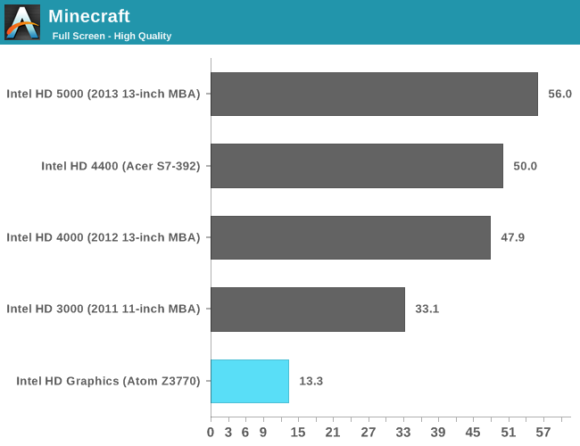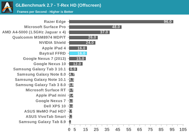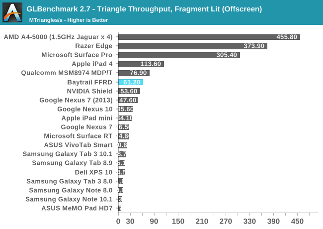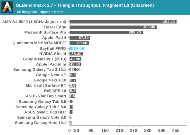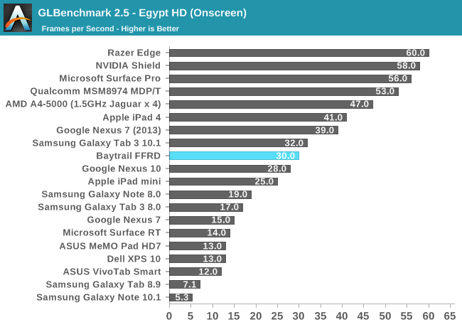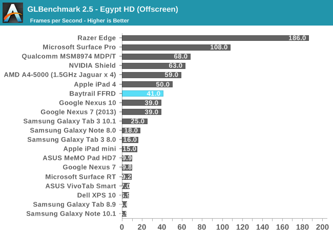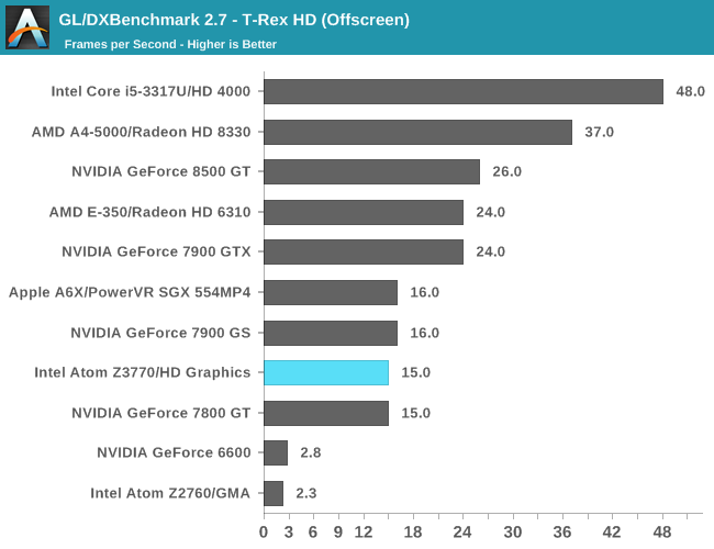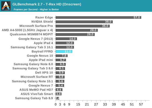 GPU方面喜忧参半。这是Intel核显第一次进入移动领域,相比于之前PowerVR GMA有了翻天覆地的变化,性能提升动辄四五倍,但这是建立在之前性能太弱的基础上的。四个单元的核显基本和iPad 4 PowerVR SGX 554MP4处于同一档次,但如今看来已经比较平庸,在高通、NVIDIA面前仍旧抬不起头来。