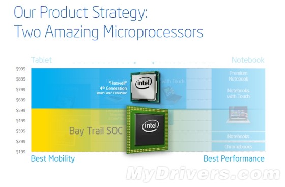Bay Trail-M、Bay Trail-D面向入门级笔记本、桌面,但是品牌不属于Atom,而是划归到奔腾、赛扬。