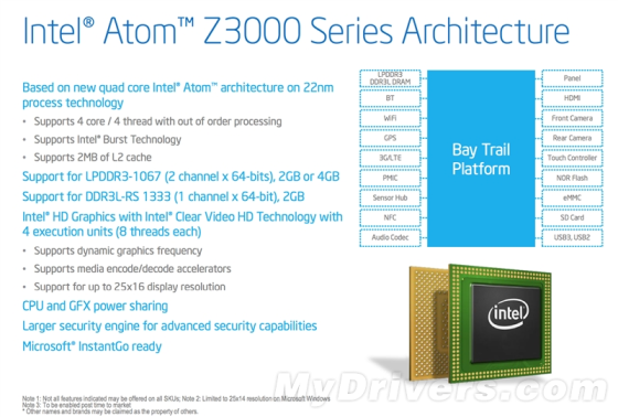 Bay Trail-T Atom Z3000系列的发布标志着Intel开始向移动领域发起新一轮的冲击,而且不同以往,这是Atom 2008年诞生以来第一次真正意义上的架构更新,包括CPU、GPU两部分,而且第一次使用了22nm SoC新工艺,目标直指高通Krait、ARM Cortex-A15。