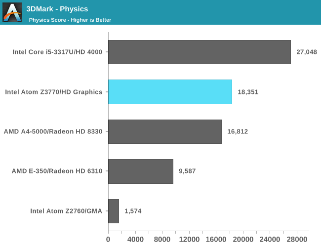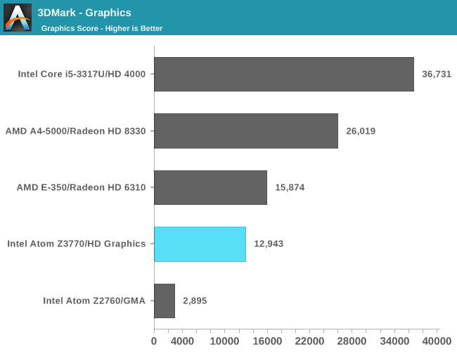 3DMark图形得分:这才是考验GPU的,结果完全不低AMD上代低功耗APU,差了足有18%,同时比Z2760提升了4.5倍,完全符合Intel宣传的,但是该哭还是该笑呢?