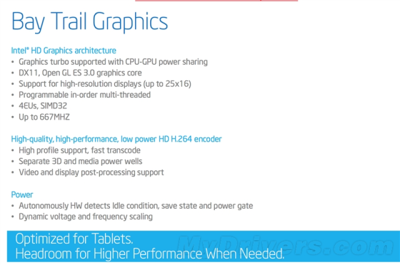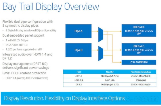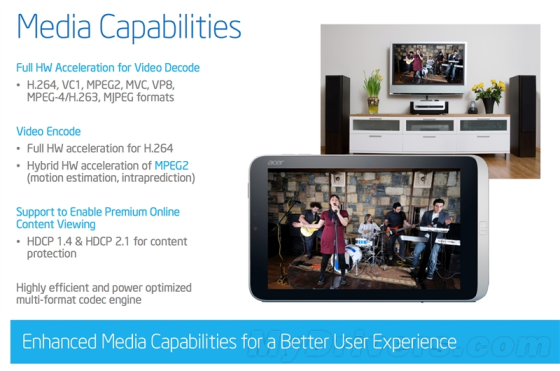 多媒体方面,支持H.264、VC-1、MPEG-2、MVC、VP8、MPEG-4/H.263、MJPEG等多种视频格式的完全硬件解码加速,H.264格式的完全硬件编码加速(MPEG-2部分加速),同时支持HDMI 1.4输出、HDCP 2.1内容保护、DP 1.2、eDP 1.3。没有提及4K。