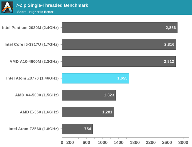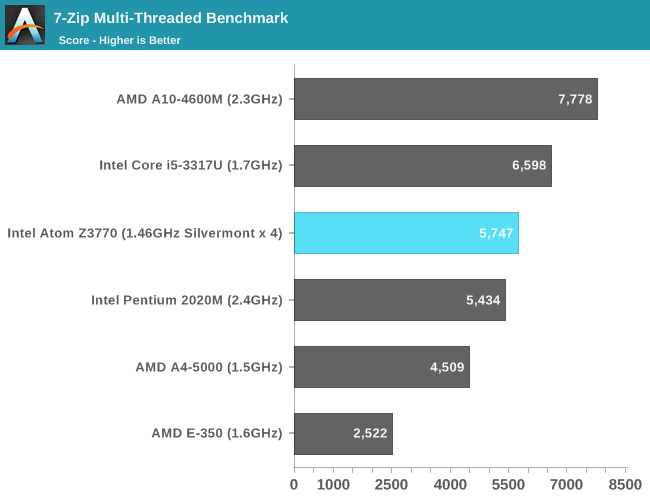 CineBench考察的主要是浮点性能,在更侧重整数性能的7-Zip里,Z3770要比A4-5000快大约25%。这次还加上了这代平板U Atom Z2560,还不到Z3770的一半。
