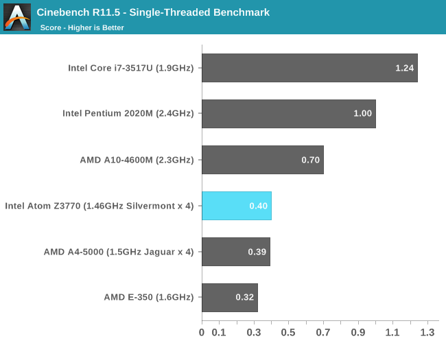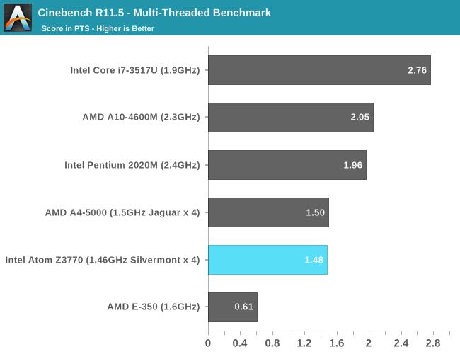 多线程性能因为都是四个核心仍然不相上下,不过此时Z3770的功耗只有大约2.5W,A4-5000估计得有6W。当然AMD还有功耗更低的Temash,但性能也会降下去。