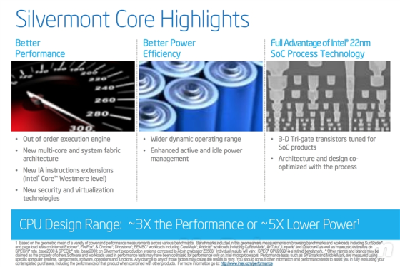 三倍的性能提升、五倍的功耗改进,这就是Silvermont的使命。至于是不是达成了,后边用数据说话。