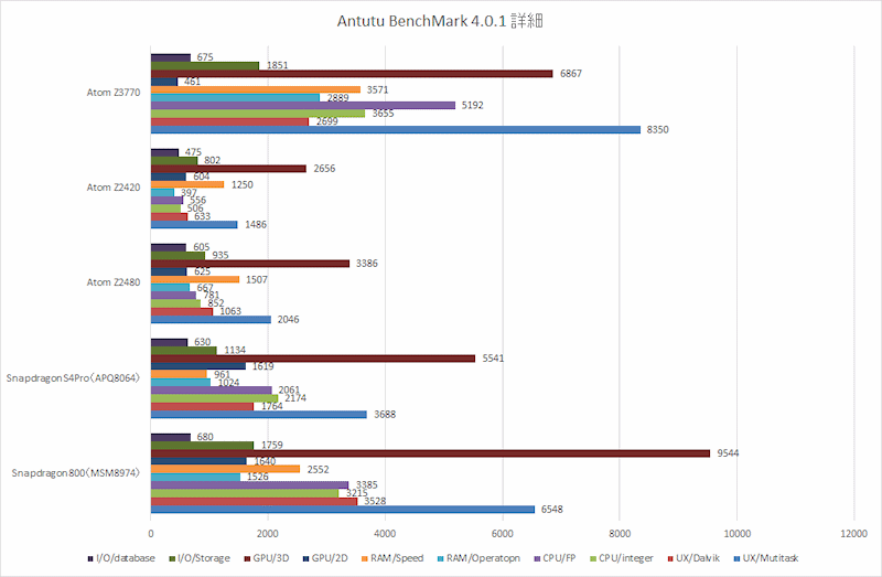 从各个子项得分看,Z3770相比于骁龙800赢在了CPU、内存、多任务上,但是虚拟机、GPU差得很多,尤其是GPU。这和刚才看到的结果相符合,也说明安兔兔现在的确更加公平了。
