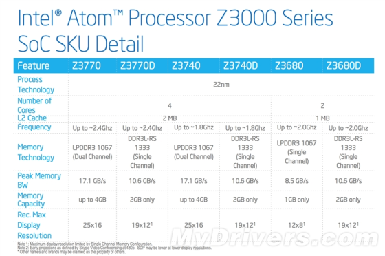 Z3600系列有两款型号Z3680、Z3680D,均为双核心双线程、1MB二级缓存、最高主频2.0GHz。前者支持单通道LPDDR3-1066内存,带宽8.5GB/s,最大容量1GB,最高分辨率1280×800,后者则是单通道DDR3L-RS-1333内存,带宽10.6GB/s,最大容量2GB,最高分辨率1920×1200。