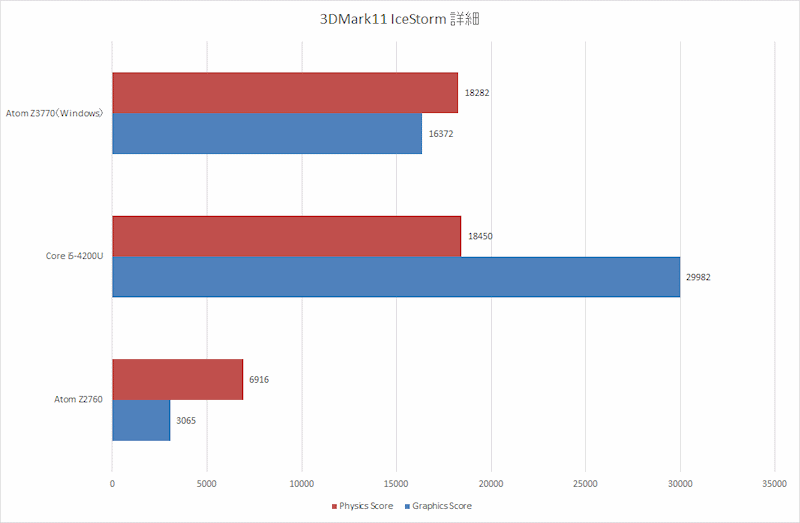 3DMark Ice Storm:总成绩和E-350差不多,不太给力啊,不过对比羸弱的Z2760,差距达到了5.7倍。