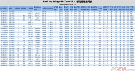 IVB-E产品主要还是面向服务器市场,在Intel官方网站上查询发现,随着三款桌面级IVB-E发布的Xeon总共有27款产品,它们都属于Ivy Bridge-EP Xeon E5 V2系列。以下我把它们的规格列表做了一些精简,并列出来。