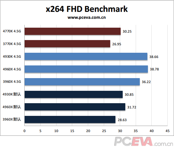 X264 FHD Benchmark测试,IVB-E依然仗着核心数领先,4930K和4960X同频下成绩差距并不大,并且都能拉开3960X大约7%的差距。