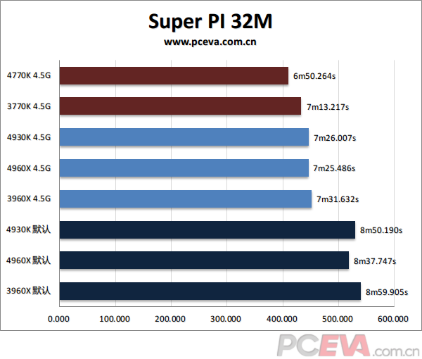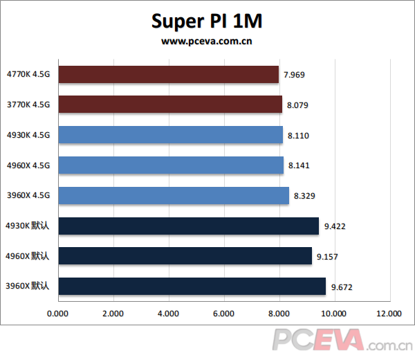 Super PI 1M基本看核心及L1缓存,所以最先进的HSW架构4770K取得第一,3770K、4930K、4960X同属IVB架构,成绩基本在误差范围内,而SNB-E架构的3960X则要慢个0.2秒。