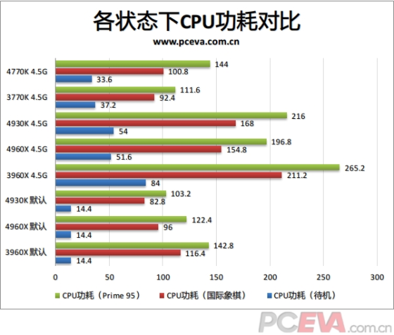 来看一下待机、运行国际象棋和Prime 95烧机时的功耗对比,超频之后所有处理器节能关闭,所以待机功耗会提升不少。我们可以看到,在开启节能时,SNB-E和IVB-E的待机功耗都差不多, 加上供电损耗基本测不出区别来。在关闭节能后,IVB-E的待机功耗比SNB-E有明显优势,直接少了30W。