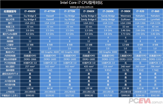 再看i7-4960X与前代i7的规格对比: