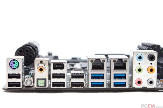 背部IO接口:一个PS2键鼠接口、6个USB2.0、4个USB3.0、一个1394接口,SPDIF同轴、光纤接口各一个,一个清CMOS按钮、两个RJ45网络接口和7.1声道音频接口。