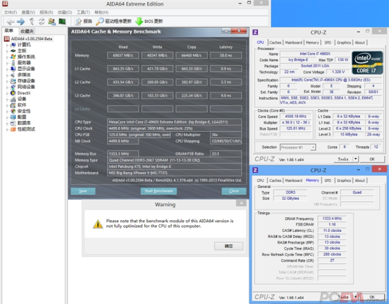 在超频到4.5G之后,两颗IVB-E处理器的AIDA64内存写入成绩不正常,是软件版本问题,相信后续软件会改善。相比SNB-E有提升的项目也基本集中在SuperPI、3DMark物理测试和渲染类上,和SNB到IVB、IVB到HSW的进步很相似。