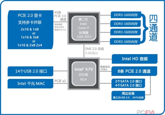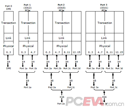 和SNB-E一样,IVB-E的核心提供4个PCIE Port,其中第一个Port(下图Port 0)为4x PCIE 2.0带宽,和X79芯片组通过DMI总线直连,这4x带宽并未计入上边提到的40x总数。