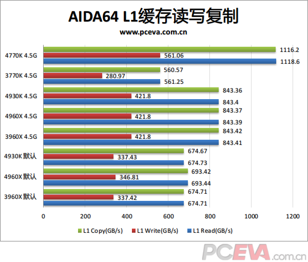 L1缓存方面,频率和核心数直接影响最终成绩。只有HSW架构的缓存位宽翻倍,所以四核心4.5G成绩就达到了3770K的整整两倍,而4930K、4960X和3960X在同频下也因为多2个核心而比3770K提升50%。