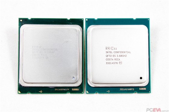 本次我们使用的是ES版的i7-4960X,步进同正式版一样为S1,产地哥斯达黎加,跟3960X对比,外观并无太大变化,封装尺寸 52.5x45mm,顶盖尺寸38.5x38.1mm,不过顶盖上的字体变成了和IVB之后一样的粗体。另外PCB的颜色也比SNB-E更浅一些。