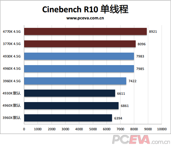 首先是Cinebench R10单线程,IVB-E在这里没有优势,HSW 4770K依然仗着架构优势一马当先,3770K、4960X和4930K这三个IVB架构的基本在8000分左右,3960X则落后一些。