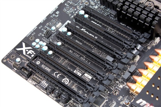 PCIE插槽:7条PCIE插槽全是16x的长度,其中第一条永远运行在16x,第七条永远运行在8x,第五条和第三条共享16x带宽,其它为1x的速度。