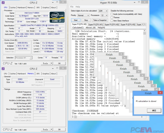 Super PI 32M则在核心、缓存的基础上,更加考验缓存与内存,内存延迟对成绩有比较大的影响。HSW架构还是由于更快的L1缓存而取得领先,3770K则因为我运行DDR3-2666内存,延迟更低而取得第二名,4930K、4960X基本处于同一水准,比3770K稍慢,但我觉得IVB-E的L3缓存更大,按理说应该至少不会比3770K差才对,可能是主板BIOS优化还不到位。