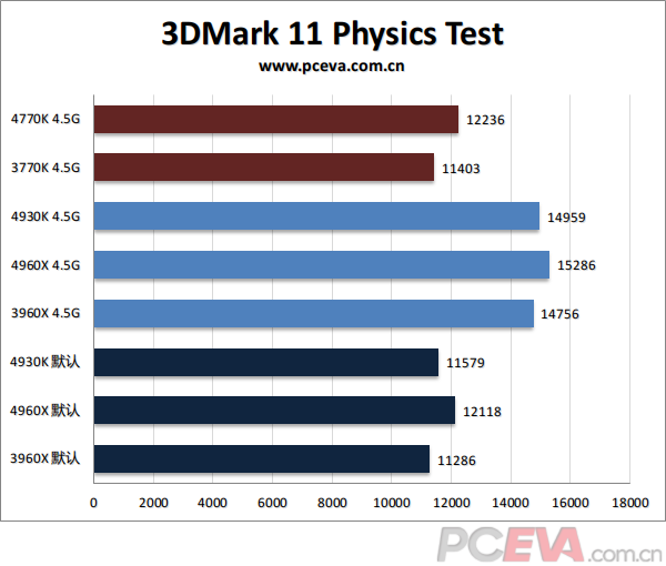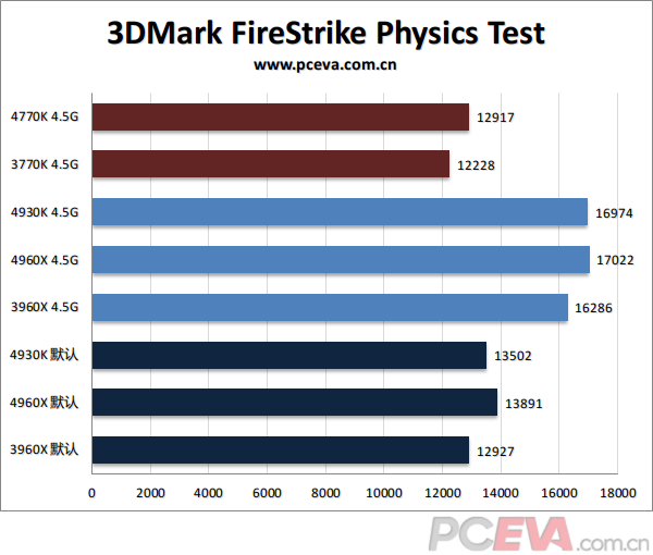 3DMark物理测试系列,4960X比3960X有大约4-5%的提升,4960X相比4930K并无太大区别,并且都以核心优势和3770K、4770K拉开很大的差距。其中3DMark Vantage的差距最大,3D11和FireStrike则小一些,后两者对内存效能更为敏感一些。