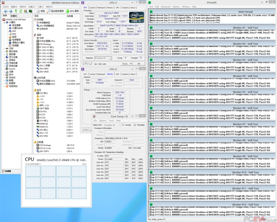 在室温26度、裸机的条件下,我们使用海盗船H100i水冷散热器,这颗4960X以核心电压1.335V、VTT电压1.15V、VSA电压0.9V通过4.5GHz稳定性测试,最高核心温度为73度。