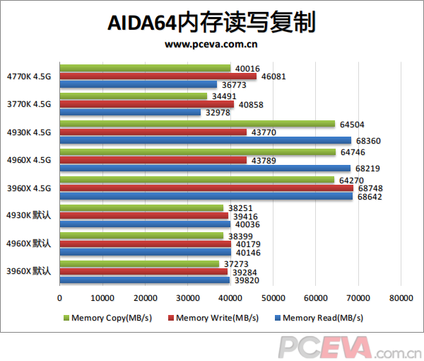 在默认设置下,IVB-E和SNB-E的内存效能都差不多,IVB-E稍微略有提升一些。超频之后,由于IVB 和HSW平台tRDRD跑5,所以读取和复制并不是当前频率下的最佳成绩,而3960X在超频之后表现非常强劲,内存读取和写入都达到68000MB/s 以上,如果超CPU主频还会提升更多。两颗IVB-E处理器的内存成绩除了写入不正常之外,读取和复制和SNB-E差不多,说明SNB-E和IVB-E的 内存效能应该处于相同水平,并且同样都是提升主频就能提升更多。