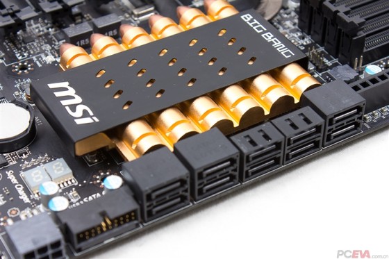 MSI BigBang XPower II主板配备10个SATA接口,其中从左到右依次是两组第三方Asmedia ASM1061提供的SATA3.0接口、两组原生SATA2.0接口和一组原生SATA3.0接口。PCH散热片采用弹夹形态设计,金闪闪的光泽在这张 几乎全黑的主板上亮瞎眼。
