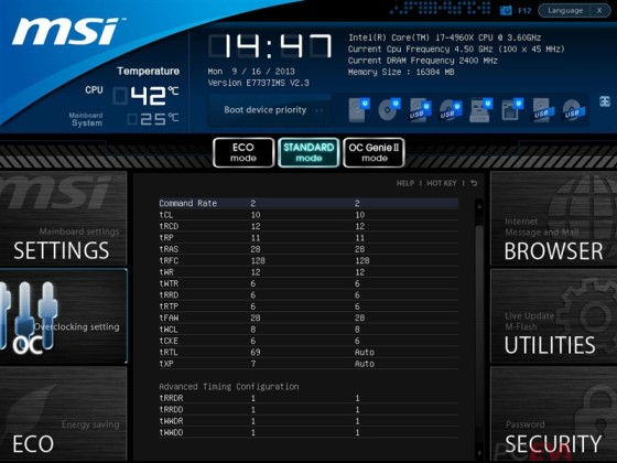 BIOS设置:从微星官方网站下载V2.3版本BIOS,可直接通过U盘刷新,刷新之后即可使用IVB-E处理器,新的BIOS还是Click BIOS II界面。