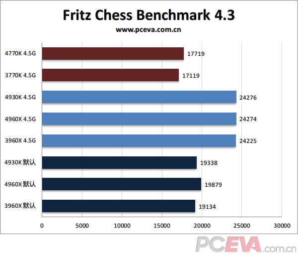 多线程方面,国际象棋由于算法比较旧,所以从Nehalem架构之后似乎都没有太大提升,只随着频率的提升而提升。所以3960X和4930K、4960X在同频时基本都处于同一水平,并且以多出50%线程的优势大幅领先3770K和4770K。