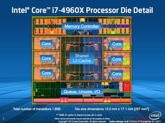 与3960X一样,4960X的命名“提后”了一代,虽然还是基于Ivy Bridge架构,但命名却到了4系列,和Haswell一样,千万别搞混了。另外,IVB-E核心面积为257平方毫米,相比SNB-E的435平方毫 米大幅缩小,除了制程从32nm进步到22nm之外,还因为它是原生6核心设计,少了两个核心和对应的L3缓存,自然晶体管也少了一些。